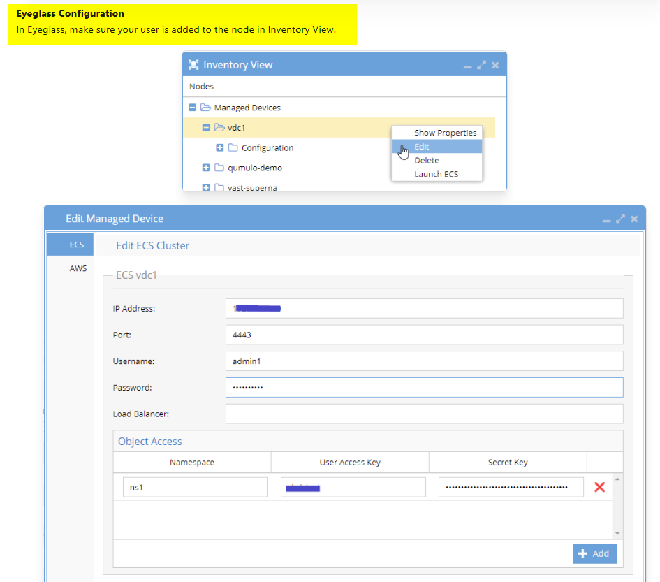 - Add the ip address of the ECS management IP, the eyeglass service account user and password.