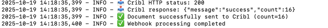 - In the log below the response code from the cribl api call should show http 200 status code and successCount 1 to indicate the Finding was successfully created.