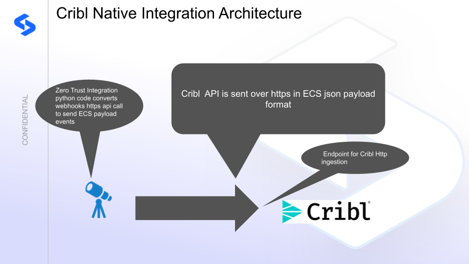 Customers using Cribl can leverage this integration to send real time zero trust alerts using webhooks and maintain full payload parsing using json defined fields. The Cribl Alert Ingestion Connector capability within the platform allows inbound webhook json payload to be parsed and turned into host status updates. Customers can then use Cribl to use the transformation and multiple destination sync to various security tools.