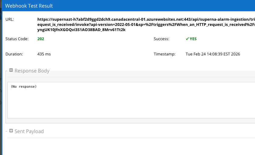 - The results will show each alarm sent from Defender Webhook including the test webhook.