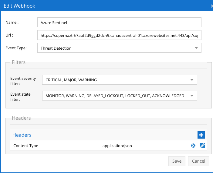 - Recommended Configuration: Only Critical and Major events and only the webhooks that set lockout or delayed lockout. Customers can customize based on specific requirements. The goal is to send findings versus a list of alarms that do not pinpoint a security incident.