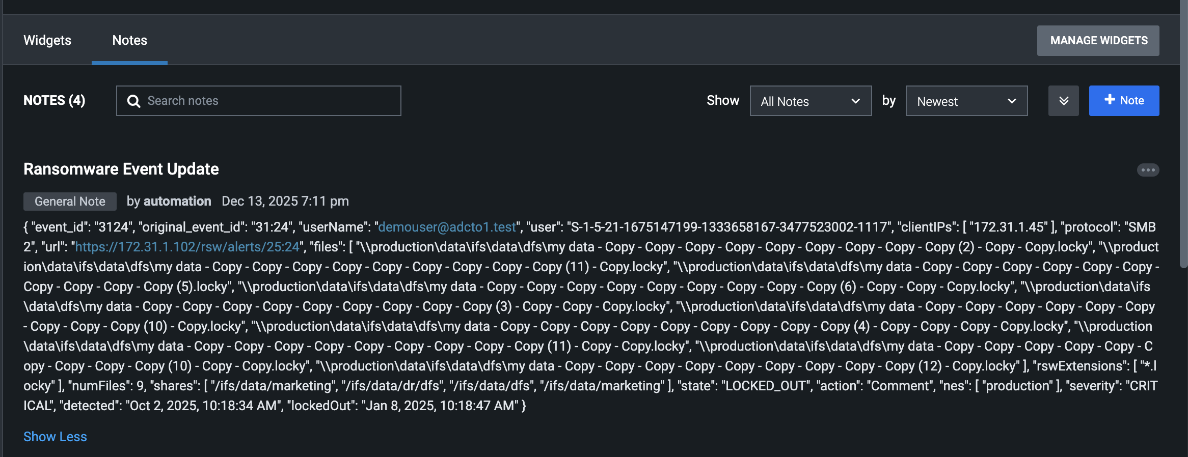 - Updates to that event in Data Security Edition will append notes to notes field of event based on matching the alarm ID in DSE to the event created in Splunk SOAR.
