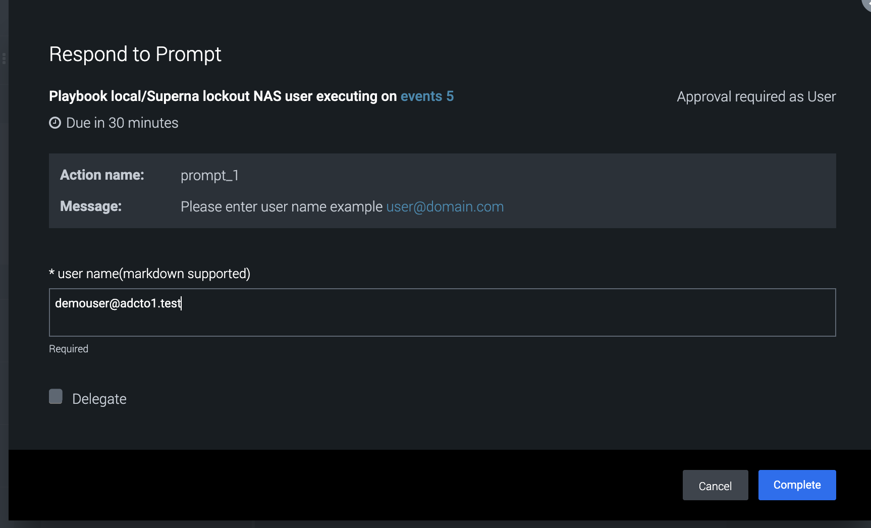 - This playbook requires user input for the username