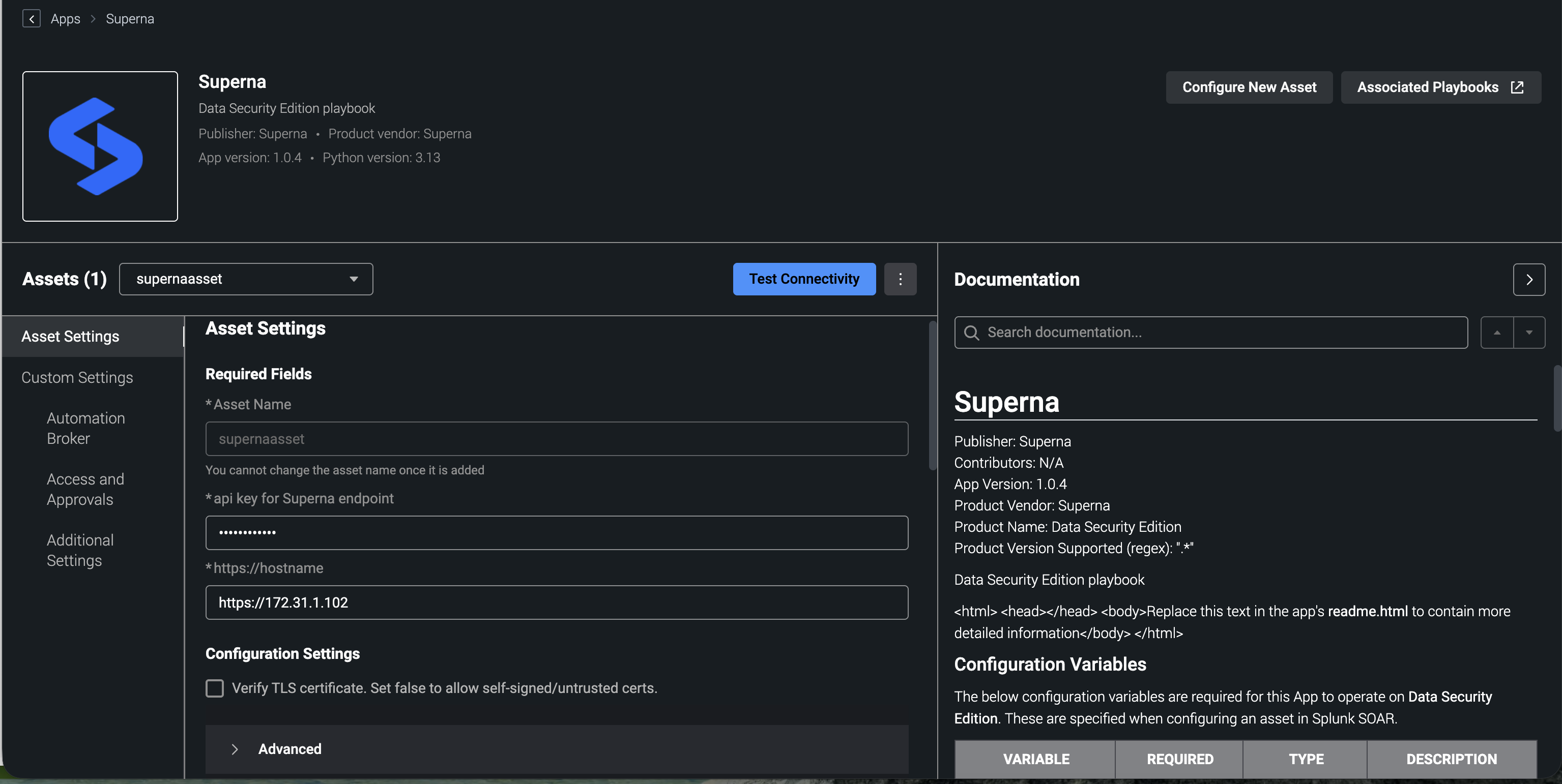 - Once successfully tested you should have a fully configured application in Splunk with 4 actions and 1 asset